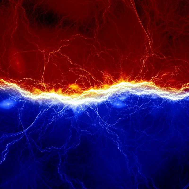 Crédence sur mesure où les élements se déchaînent...rouge et bleu.