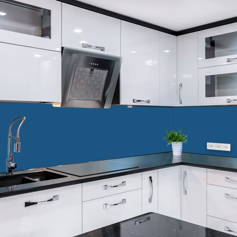 Crédence sur mesure couleur Bleu capri RAL 5019 en verre trempé de 6 mm d'épaisseur.
