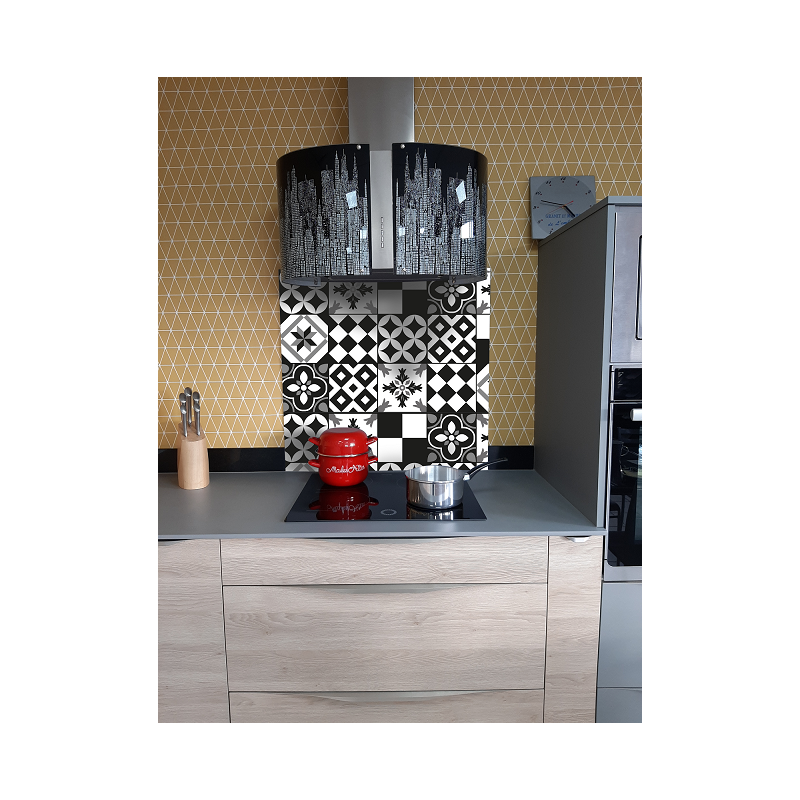 Crédence en verre feuilleté - trempé épaisseur 8.5 mm avec l’inclusion de votre motif entre deux verres sécurit de 4 mm.