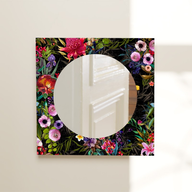 Miroir fabriqué selon un procédé inédit! Montage en feuilleté avec inclusion de votre motif sur le pourtour de la glace argentée.